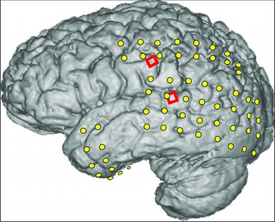 本圖顯示了置于癲癇癥患者大腦頂部的兩種電極。較大的標(biāo)有數(shù)字的電極就是腦皮層電圖電極。此外,志愿者大腦的兩個(gè)語言區(qū)頂部還被置放兩組更小的微電極陣列。