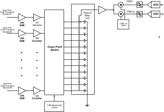 典型的相控陣CWD(連續(xù)波多普勒)架構(gòu)中,超聲傳感器的聚焦孔徑分成兩部分,一半的(64至128個(gè))傳感器單元用于發(fā)送器,另一半用于接收器。作用在發(fā)射單元的信號(hào)是方波信號(hào),典型頻率為2.0 MHz至7.5 MHz多普勒頻率。發(fā)射單元通過(guò)發(fā)送適當(dāng)相位的信號(hào)聚焦發(fā)射波束。同樣,CWD接收信號(hào)通過(guò)對(duì)每個(gè)接收單元的信號(hào)進(jìn)行相位調(diào)整、求和進(jìn)行聚焦。