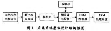 醫(yī)學超聲診斷成像技術大多數采用超聲脈沖回波法,即利用探頭產生超聲波進入人體,由人體組織反射產生的回波經換能器接收后轉換為電信號,經過提取、放大、處理,再由數字掃描變換器轉換為標準視頻信號,最后由顯示器進行顯示。在基于FPGA+ARM 9硬件平臺的全數字化B超診斷儀中,前端探頭返回的回波電信號需由實時采集系統(tǒng)進行波束合成、相關處理、采集并傳輸至ARM嵌入式處理系統(tǒng),視頻信號數據量大,實時性要求高,因此選用FPGA+SRAM構成實時采集系統(tǒng),在速度和容量上都能滿足上述要求。主要介紹B超成像系統(tǒng)中應用FPGA進行邏輯控制進行超聲視頻圖像采集的原理和實現。