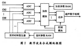 對于具有128陣元和32收發(fā)通道的超聲探頭,在進行32路AD轉換后,將其分為4組,每組8路接收通道,每組用一片FPGA實現,在該FPGA內首先進行接收延時和動態(tài)聚焦再進行加權求和,其后再進行組間的求和產生超聲數字視頻信號。每一組的系統(tǒng)框圖如圖2所示: