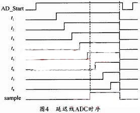 給定一個開始信號AD_Stan,經(jīng)一定時間間隔后產(chǎn)生一個采樣脈沖信號sample,作為D觸發(fā)器的控制信號。在采樣信號有效時對D觸發(fā)器的輸入信號進行鎖存,將D觸發(fā)器的輸出信號送至譯碼電路得到最后的誤差信號。圖4是延遲線ADC的時序圖,假設(shè)圖2中n=8。在采樣信號有效時,AD_Start信號正好傳到第5個延遲單元,于是q1~q5輸出為1,q6~q8輸出為0。采樣電壓越大,延遲時間td越小,信號傳播得越快,輸出的溫度計碼中的1的個數(shù)越多。譯碼電路再將溫度計碼轉(zhuǎn)換為所需要的二進制碼。延遲線ADC即通過輸入電源對延遲鏈供電,根據(jù)延遲鏈延遲時間的大小來確定輸入的大小。