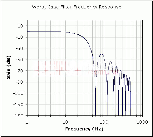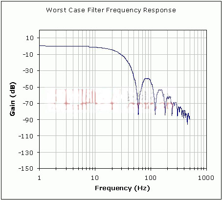 圖1為理想時(shí)鐘條件下的濾波器頻響曲線。該濾波器在陷波頻點(diǎn)對(duì)60Hz的抑制接近無窮大。圖2給出了同樣的SINC3濾波器頻響特性曲線,但其中加入了±4%的時(shí)鐘公差。該濾波器在陷波頻點(diǎn)提供-83.7dB抑制。