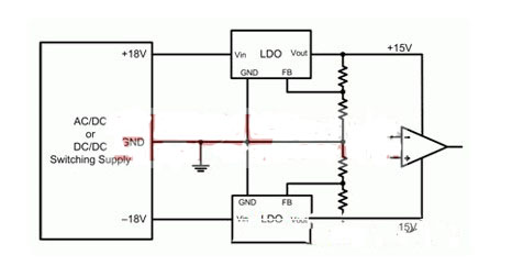 圖 2 顯示了一個典型運算放大器電源電路的示意圖。此處,一個開關電源提供一個正 18V 和一個負 18V。兩低壓降 (LDO) 線性穩(wěn)壓器進一步將 ±18V 調節(jié)至 ±15V。該 LDO 一般安裝在電源和運算放大器之間,旨在降低開關電源產(chǎn)生的高頻開關噪聲。LDO 具有較高的電源抑制(以比率表示,PSRR),其減弱了寬帶頻率下 LDO 輸入的噪聲。