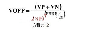 方程式 2 所示 PSRR 以分貝表示,其可在大多數(shù)運算放大器產(chǎn)品說明書中找到。方程式 2 給出了以運算放大器輸入為參考的補償電壓。用方程式 2 所得結果乘以運算放大器增益,運算放大器輸出可參考補償電壓。