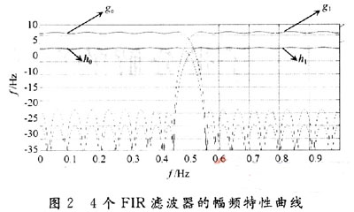 H1(z)=H0(-z),G1(z)=-2H0(-z),G0(z)=2H1(-z)。由上述表達(dá)式可知設(shè)計(jì)的關(guān)鍵是設(shè)計(jì)H0(z),只要H0(z)確定,H1(z),G0(z),G1(z)也可確定。本文采用等波紋逼近設(shè)計(jì)法進(jìn)行濾波器設(shè)計(jì)。該方法設(shè)計(jì)的濾波器呈現(xiàn)等波紋頻響特性。等波紋逼近設(shè)計(jì)法設(shè)計(jì)的濾波器具有如下優(yōu)點(diǎn):