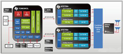 如圖3所示,TI支持集成型數(shù)字前端技術(shù)的基帶SoC(TCI6630K2L)與TI集成型無線電收發(fā)器解決方案(AFE750x)及其它TI時(shí)鐘、電源、RF器件緊密結(jié)合,再加上生產(chǎn)就緒型軟件,可實(shí)現(xiàn)高性能小型蜂窩解決方案,實(shí)現(xiàn)可滿足PoE要求的最佳功耗、低BOM成本、快速上市進(jìn)程以及支持不斷演進(jìn)異構(gòu)網(wǎng)絡(luò)策略的高靈活性。