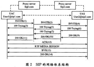 圖2中,User@sipl.com作為UAC,希望同User2@sip2.com通話,UAC首先發(fā)送一個(gè)INVITE請(qǐng)求,本地的SIP代理服務(wù)器sipl.com接收到這個(gè)INVITE請(qǐng)求后,經(jīng)過(guò)地址解析,將其發(fā)送至SIP代理服務(wù)器sip2.corn,同時(shí)sip1.com返回給User1一個(gè)100 Trying消息。sip2.com接收到sip1.com的INVITE請(qǐng)求后,將其轉(zhuǎn)發(fā)給user2@sip2.com,并返回給sip1.com一個(gè)Trying消息。User2接收到INVITE請(qǐng)求后,在應(yīng)答之前,將返回給sip2.com一個(gè)180 Ringing消息,此Ringing消息將依次轉(zhuǎn)發(fā)給sip1.com,User1。如果User2決定應(yīng)答呼叫,則返回一個(gè)200 OK消息,此消息經(jīng)過(guò)sip2.com,sip1.com,最后到達(dá)User1。User1在收到200 OK消息后,直接發(fā)送一個(gè)ACK確認(rèn)消息給User2。至此呼叫建立過(guò)程完成,User1和User2之間可以建立媒體通道進(jìn)行對(duì)話。當(dāng)一方想結(jié)束通話時(shí),發(fā)送一個(gè)BYE消息給對(duì)方,對(duì)方返回一個(gè)200 OK消息,SIP呼叫即被終止。
