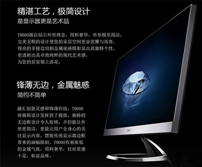 首先就要說(shuō)到外形設(shè)計(jì),外形,是HKC顯示器今年的一貫亮點(diǎn),不論是T7000+、T4000+等高端產(chǎn)品還是T3000+、T2000Pro這樣的入門(mén)產(chǎn)品,每一款可以說(shuō)都極盡設(shè)計(jì)之所能。T9000當(dāng)然也不會(huì)例外,T9000的設(shè)計(jì)源自鉆石外形理念,用料極其奢華,锃亮的多棱邊切割金屬底座,讓人感覺(jué)這宛如是出自知名設(shè)計(jì)大師手下的概念性IT藝術(shù)品,真正的無(wú)邊框設(shè)計(jì),擺脫一切視覺(jué)上的束縛,讓華麗巨屏盡情呈現(xiàn)其視覺(jué)優(yōu)勢(shì)。