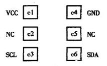 IC 卡 是將 一塊集成電路芯片鑲嵌在塑料基片中,封裝為卡片形式,其芯片具有寫人數(shù)據(jù)和存儲(chǔ)數(shù)據(jù)的能力。我們使用的是美國ATMEL公司生產(chǎn)AT24COIA存儲(chǔ)器型IC 卡。串行EEPROM AT24COIA的容量為1Kb ( 128x 8 位),擦寫次數(shù)為100001)周期,數(shù)據(jù)保存期可長達(dá)100年。這種IC卡所使用的模塊符合ISO/IEC7816協(xié)議,其觸點(diǎn)如圖1所示。這里cI(VCC)為電源端;c2(NC)未用,c3(SCL)為串行時(shí)鐘輸人端,c4 (GND)為接地端,c5(NC)未用;c6(SDA)為串行數(shù)據(jù)輸人/輸出端。