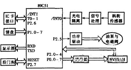 本加油機(jī)控制系統(tǒng)由單片機(jī)及存儲(chǔ)器、測(cè)量及控制、IC卡接口、鍵盤及顯示、看門狗等部分所組成,其硬件原理框圖如圖2所示。