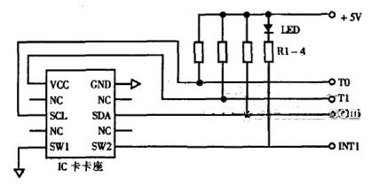 根據(jù) IC卡的電氣特性設(shè)計(jì)的IC卡接口電路原理圖見圖3。其中TO(單片機(jī)作為常規(guī)輸出)提供串行時(shí)鐘輸人信號(hào);串行I/0通過單片機(jī)的P2.6 實(shí)現(xiàn);TI(8 9C51作為常規(guī)輸人)檢測(cè)IC卡的供電情況,為保護(hù)IC卡我們采用了限流供電措施;卡座中有否IC卡由單片機(jī)INT1(同樣作為常規(guī)輸人)來檢測(cè),并且,當(dāng)IC卡插人后微動(dòng)開關(guān)SWi一SW2吸合,LED亮,反之LED滅。