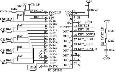采用Quantum Research Group公司的電容式觸摸按鍵模塊IC QT1801,[2]具有功耗低,外圍電路簡單,可同時支持8個觸摸按鍵輸入等特點。經(jīng)過內(nèi)部濾波整形后,在對應(yīng)的按鍵口輸出邏輯電平,根據(jù)外圍電阻值的不同選擇可以設(shè)置IC QT1801的各種模式?! 」ぷ髂J降脑O(shè)置如下:在全模式(Full Option Mode)下,需在引腳SNSx(x=0,1,…,7)接1 MΩ電阻;在精簡模式下,需在引腳SNS6K和SNS7之間串接一個1 MΩ電阻。按鍵輸出值模式有2種:Oneperkey和Binary Code。當(dāng)有按鍵觸摸時在24引腳(DETECT)產(chǎn)生觸摸中斷信號,高電平有效。其中,CS1~CS5為觸摸按鍵輸入,其接口電路如圖2所示。