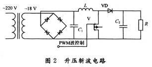 系統(tǒng)主硬件電路由電源部分、整流濾波電路、DC/DC轉(zhuǎn)換電路、驅(qū)動(dòng)電路、MSP430單片機(jī)等部分組成。交流輸入電壓經(jīng)整流濾波電路后經(jīng)過DC/DC變換器,采用Boost升壓斬波電路DC/DC變換,如圖2所示: