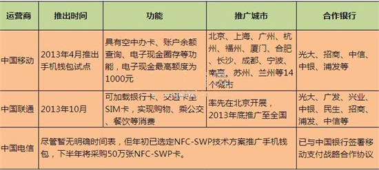 2013年4月份,中國(guó)移動(dòng)開始推出手機(jī)錢包業(yè)務(wù),具備空中辦卡、賬戶月查詢、電子現(xiàn)金圈存等功能,這促使中國(guó)聯(lián)通和中國(guó)電信等其他運(yùn)營(yíng)商跟進(jìn)。在10月份,中國(guó)聯(lián)通推出手機(jī)錢包業(yè)務(wù),用戶可以通過(guò)客戶端下載、營(yíng)業(yè)廳寫卡等多種途徑,將銀行卡、交通卡等與聯(lián)通SIM卡綁定,實(shí)現(xiàn)購(gòu)物、出行、餐飲等刷手機(jī)消費(fèi),未來(lái)加油卡、會(huì)員卡以及各類優(yōu)惠券等新功能也將不斷加入,并已經(jīng)在北京、廣東、江蘇等多個(gè)區(qū)域展開手機(jī)錢包測(cè)試工作,預(yù)計(jì)2013年底將推廣至全國(guó)各地。中國(guó)電信盡管暫無(wú)明確的時(shí)間表,但2013年初就已經(jīng)選定NFC-SWP技術(shù)方案來(lái)推廣手機(jī)錢包,預(yù)計(jì)2013年將采購(gòu)50萬(wàn)張NFC-SWP卡。