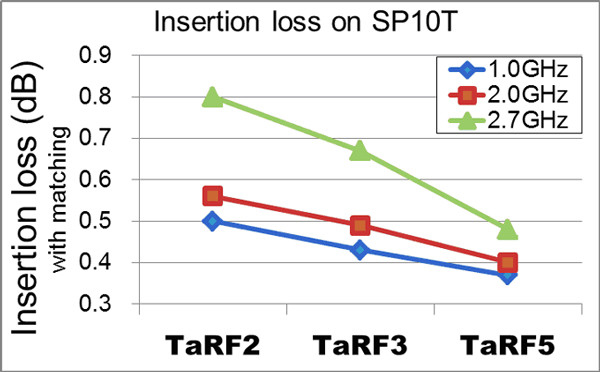 新產(chǎn)品運(yùn)用了“TaRF5”—一種采用絕緣硅(SOI)技術(shù)[6]打造的新一代TarfSOI?(東芝先進(jìn)的RF SOI)[5]工藝。相較于采用TaRF3工藝打造的產(chǎn)品而言,采用TaRF5工藝打造的新樣品的插入損耗(f=2.7GHz)改善了25%,尺寸縮小了40%。這些改進(jìn)可延長電池工作時(shí)間,縮小安裝空間,還有助于縮小應(yīng)用產(chǎn)品的尺寸。