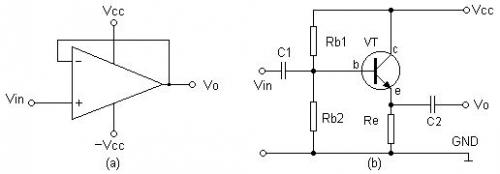 圖中,(a)為應(yīng)用集成運(yùn)算放大器的跟隨器電路,(b)為應(yīng)用分立元件構(gòu)成的跟隨器電路??梢钥吹綉?yīng)用集成運(yùn)算放大器構(gòu)成的跟隨器電路比應(yīng)用分立元件構(gòu)成的跟隨器電路簡單得多。
