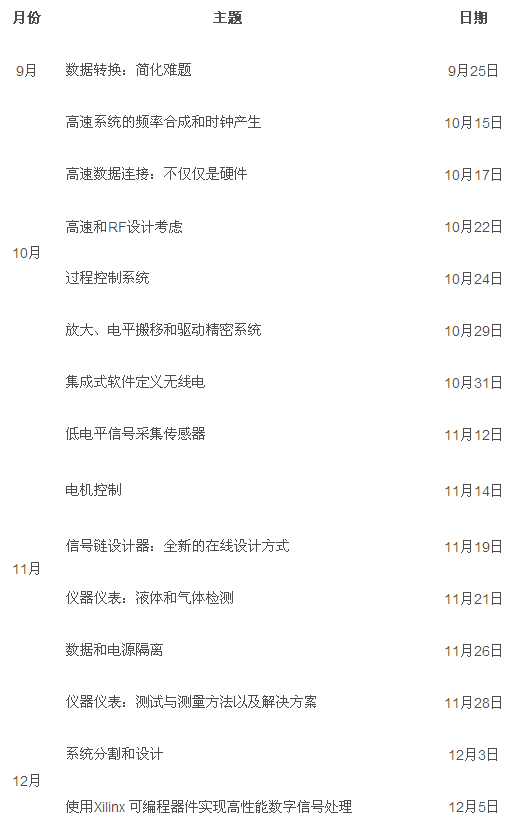 在接下來的活動中, ADI 2013在線設(shè)計峰會將安排共6場高水準的在線研討會,包括ADI專家團隊帶來的實現(xiàn)更高信號處理性能與參考設(shè)計和系統(tǒng)應(yīng)用為主題的技術(shù)指導(dǎo),如“數(shù)據(jù)與電源隔離”、“系統(tǒng)分割與設(shè)計”、“液體與氣體檢測”等精彩主題,活動合作伙伴Xilinx還將展示他們基于ADI模擬和混合信號技術(shù)的領(lǐng)先解決方案。關(guān)注這些熱門主題的中國工程師們現(xiàn)在即可登陸ADI 2013在線設(shè)計峰會官方頁面并注冊參會,精彩不容錯過。本次峰會全部結(jié)束后,ADI還將貼心的對所有主題研討會的視頻和技術(shù)資源進行為期四個月的在線展示,讓錯失某期話題研討的工程師們不留遺憾。