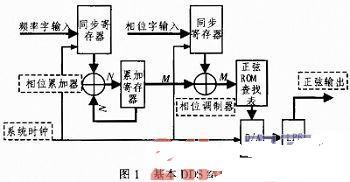 從本質(zhì)上看,DDS是一個(gè)恒定高頻率運(yùn)行的多位計(jì)數(shù)器。在溢出時(shí),通過利用一個(gè)多位控制字來設(shè)置計(jì)數(shù)器步進(jìn)的尺寸,允許計(jì)數(shù)器過零。計(jì)數(shù)器的高階位用來尋址存儲(chǔ)設(shè)備,該設(shè)備保持生成的一個(gè)波形周期的數(shù)字記錄。高頻時(shí)鐘每前進(jìn)一單位,計(jì)數(shù)器便步進(jìn)一次,存儲(chǔ)器也將生成一個(gè)新的地址字,而新的波形數(shù)據(jù)值將會(huì)發(fā)送到DAC.DDS主要有3個(gè)優(yōu)點(diǎn):1)輸出信號(hào)的頻率精度可以達(dá)到作為發(fā)生器參考信號(hào)使用的晶體控制振蕩器的水平;2)DDS發(fā)生器可以生成非常高的頻率精度;3)如果有RAM波形存儲(chǔ)器,那么DDS函數(shù)發(fā)生器可以重現(xiàn)幾乎任何波形。