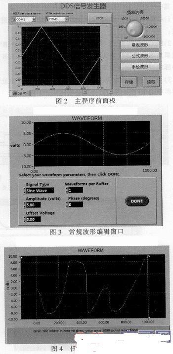 圖2為虛擬儀器上位機(jī)主面板,通過串口設(shè)置窗口選擇通信端口,采用cluster捆綁各操作類型并通過case結(jié)構(gòu)判斷所選操作,選擇常規(guī)波形、公式波形及手繪波形會(huì)分別彈出對(duì)應(yīng)的編輯窗口顯示波形數(shù)據(jù)。如圖3和圖4所示,為選擇常規(guī)波形和手繪波形彈出的波形參數(shù)設(shè)置對(duì)話框,設(shè)置完相應(yīng)的波形后,單擊done按鈕確認(rèn)。設(shè)置完波形后,可以點(diǎn)擊保存波形數(shù)據(jù),把繪制好的波形以二進(jìn)制文本形式進(jìn)行保存。