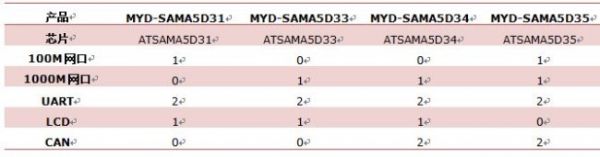 MYD-SAMA5D3X工控板是一個工控板系列,該系列包含四款具體產(chǎn)品,MYD-SAMA5D31、MYD-SAMA5D33、MYD-SAMA5D34和MYD-SAMA5D35。這四款工控板CPU管腳完全一致,只是內(nèi)部的網(wǎng)口支持、UART串口、LCD液晶屏和CAN總線等資源稍微有所區(qū)別,客戶可以根據(jù)應(yīng)用場合和成本自行選擇合適的型號。如下是這四款產(chǎn)品的區(qū)別。