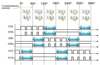 如圖2所示,三相BLDC電機(jī)控制可采用三相六拍的控制方法,每隔60個(gè)電角度進(jìn)行換向控制,同時(shí)對三相橋PWM控制可采用單極性控制策略,上橋采用PWM控制,下橋可直接導(dǎo)通與地相連,其優(yōu)點(diǎn)在于控制簡單,較低的MOS管開關(guān)損耗及較低的EMC噪音。