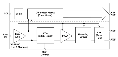 一個主要的改進方面就是將越來越多的模擬有源器件集成在一個芯片上,進而減少系統(tǒng)所需的 IC 數(shù)量。就一個典型的超聲波接收鏈而言,每個傳感器可能都需要四個器件,其中三個為放大器。憑借現(xiàn)代設計與工藝,IC 供應商現(xiàn)在可提供將LNA、VCA 以及 PGA 集成在一個可變增益放大器的器件,與分立解決方案相比最終將芯片數(shù)量減少了三分之一。另外,當前的諸多設計都在單個芯片中集成了多個 VGA 通道,從而使設計更先進一步。TI 的新型 VCA8500 便是一個極好例子,在采用了 64 引腳 QFN 封裝的單個 IC 中就集成了 8 個VGA 通道。通過緊挨 PGA 集成一個低通抗混淆濾波器,實現(xiàn)了無需額外無源或有源外部組件的情況下 VGA 輸出可以直接進入 ADC 的輸入,從而節(jié)省更多的板級空間。利用這種方法,該器件領先于其他同類產(chǎn)品。請注意,在圖 1 中,如連續(xù)波 (CW) 開關矩陣和鉗位電路等醫(yī)療成像系統(tǒng)所特有的其他功能模塊也都集成到了該器件中。