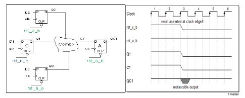 在上面的時序圖中,當有一些有效數(shù)據(jù)交易通過C1進行時,rst_c_b獲得斷言,導(dǎo)致C1發(fā)生異步改變,w.r.t clk從而使QC1進入亞穩(wěn)態(tài),這可能導(dǎo)致設(shè)計發(fā)生功能故障。