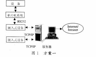 該遠程控制系統(tǒng)利用Internet/Intranet網絡資源,只需一臺聯(lián)網的PC客戶機,就可實現(xiàn)對遠程設備狀態(tài)的監(jiān)視和控制。這里,我們提出系統(tǒng)結構的兩種設計方案,如圖1、2所示。