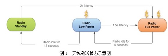 在移動(dòng)終端中,手機(jī)天線會(huì)處于空閑、低功耗、全功耗三種模式相互轉(zhuǎn)換之下。在沒有數(shù)據(jù)需要傳輸時(shí),天線處于Radio Standby狀態(tài),從Standby狀態(tài)切換到Radio Full Power需要大概2s的響應(yīng)時(shí)間,在Full Power狀態(tài)后,如果其間沒有數(shù)據(jù)需要進(jìn)行傳輸,經(jīng)過一段時(shí)間,又會(huì)回到Standby狀態(tài)。充分利用模式轉(zhuǎn)換機(jī)制,可以提高響應(yīng)速度。