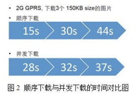 第二,并發(fā)下載技術(shù)。在GPRS環(huán)境下,以下載三張150K的圖片為例,順序下載需要44S,而在并發(fā)下載的情況只需要37S,減少了7S的時(shí)間。