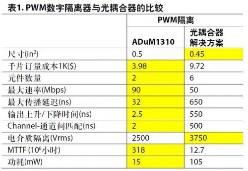 對功率級進(jìn)行脈沖寬度調(diào)制,這是所有電機(jī)驅(qū)動的核心所在。開關(guān)頻率范圍一般為10 kHz-20 kHz。在優(yōu)化控制性能時,對脈沖寬度、死區(qū)時間和通道間延遲的精密控制顯得至關(guān)重要。在為PWM控制信號選擇適當(dāng)?shù)母綦x器件時,數(shù)字隔離器在性能和成本兩個方面都要遠(yuǎn)遠(yuǎn)優(yōu)于同級別的光耦合器選項(見表1中的比較)。