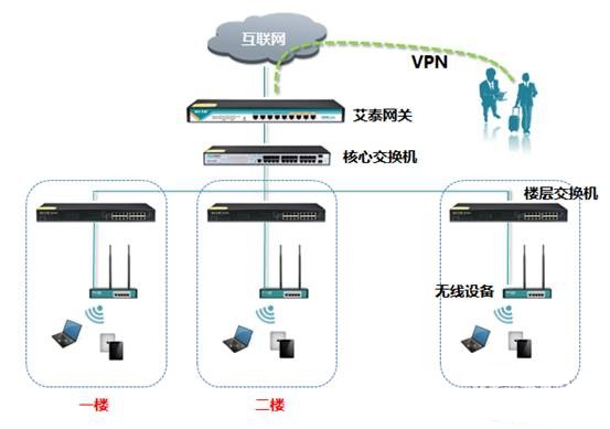 艾泰科技作為國(guó)內(nèi)知名路由器廠商之一,特別打造了適合該企業(yè)實(shí)際情況整體網(wǎng)絡(luò)解決方案。網(wǎng)關(guān)設(shè)備采用艾泰科技商睿系列高性能產(chǎn)品--4240G,為辦公用戶提供全面的上網(wǎng)行為管理、精細(xì)化限速、VPN功能;中心交換采用艾泰全千兆光口管理型交換機(jī)SG3124F,配合艾泰百兆基本型交換機(jī)SF1016作為樓層交換機(jī),同時(shí)各樓層采用著有“穿墻王”美稱的艾泰520W作無(wú)線覆蓋,輕松打造“高效、穩(wěn)定、安全、流暢”的整體網(wǎng)絡(luò)。