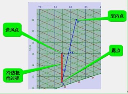 由圖中所示,室內(nèi)機(jī)既承擔(dān)機(jī)房內(nèi)的溫度也承擔(dān)機(jī)房內(nèi)濕度,勢必會造成冷熱抵消過程,見紅色過程線,以100KW的機(jī)組為例,最大冷熱抵消量為9kw。