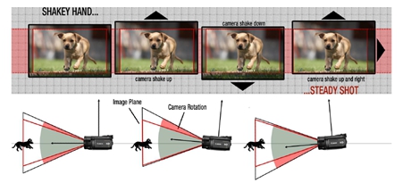 圖2. 電子影像穩(wěn)定(EIS)使用陀螺儀來(lái)檢測(cè)相機(jī)運(yùn)動(dòng)并補(bǔ)償。