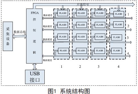(2)存儲陣列:系統(tǒng)采用4×4陣列形式,由SAMSUNG公司的K9NBG08U5A搭建而成。構(gòu)建閃存陣列時,所有FLASH使用相同的控制信號;同一列的FLASH的片選信號相同,但數(shù)據(jù)通道不同;同一行的FLASH的片選信號不同,而數(shù)據(jù)通道相同。