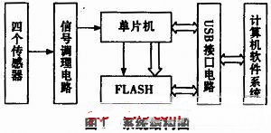 系統(tǒng)采用壓力傳感器、加速度計(jì)等對(duì)四路信號(hào)進(jìn)行采集,采集后的數(shù)據(jù)經(jīng)信號(hào)調(diào)理電路進(jìn)行濾波及放大處理后送入MSP430單片機(jī),利用單片機(jī)中自帶的A/D轉(zhuǎn)換器將模擬信號(hào)轉(zhuǎn)變成數(shù)字信號(hào)。該系統(tǒng)的采樣頻率為1 kHz,單片機(jī)通過片選(STE)信號(hào)控制按順序接收四個(gè)通道轉(zhuǎn)化的數(shù)據(jù),將數(shù)據(jù)通過單片機(jī)SPI口以100 Hz發(fā)送。采集的數(shù)據(jù)一方面存入FLASH中,另一方面通過計(jì)算機(jī)軟件進(jìn)行控制把數(shù)據(jù)經(jīng)USB接口電路讀入計(jì)算機(jī)中實(shí)時(shí)保存,并在軟件中實(shí)時(shí)顯示出四個(gè)通道的溫度曲線。系統(tǒng)的基本結(jié)構(gòu)如圖1所示。