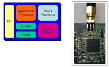 GS1010 是美國GainSpan公司最新推出WiFi 無線單片機,內核兩個ARM7微控制器器,384K閃存,224k SRAM等多種外圍電路,并將A/D,RTC和802.11無線芯片等全部內置在QFN封裝微型單芯片中(102腳 10X10平方毫米大小);實現(xiàn)了Wi-Fi系統(tǒng)的單片機化,無線化,微型化,使設計者可以采用GS1010單片機來設計微型遙控器,信用卡一樣薄的微型RFID電子標簽,能置入人體的微型傳感器等等電池供電產品和多種應用產品。該芯片功耗非常低,能夠確保在一節(jié)AA電池供電下長達5~10年的使用時間。GS1010芯片和內部結構示意圖如圖二