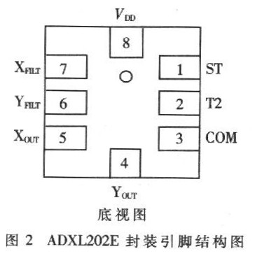 ADXL202的封裝形式為LCC-8,其封裝和引腳的示意圖如圖2所示。