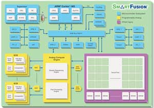 SmartFusion混合信號(hào)FPGA將高密度、基于閃存的FPGA、一個(gè)具完整外設(shè)組合的ARM Cortex -M3微控制器內(nèi)核,以及高效可編程模擬功能全部都集成在一顆單芯片上。