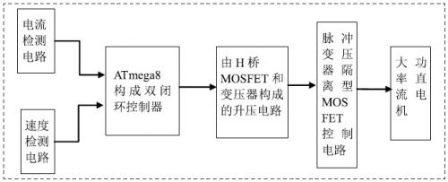 系統(tǒng)控制器主要采用的是ATmega8單片機(jī)為控制芯片。通過霍爾傳感器檢測電流,光電編碼器對速度進(jìn)行檢測。在通過單片機(jī)產(chǎn)生PWM波來控制H橋的MOSFET,對MOSFET的驅(qū)動我們采用互補式的隔離脈沖變壓器驅(qū)動。將直流電逆變?yōu)榻涣麟娫谕ㄟ^變壓器將26V的直流升壓到180V的電壓。對電機(jī)的控制我們采用的是雙閉環(huán)調(diào)速系統(tǒng)。