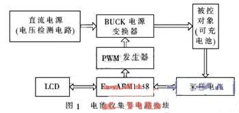 電能收集充電器的硬件設(shè)計,主要包括直流電源、電源變換器、EasyARM1138、PWM發(fā)生器、采樣電路、可充電池等部分的設(shè)計與整合,形成一個循環(huán)系統(tǒng)。其電路模塊如圖1所示。