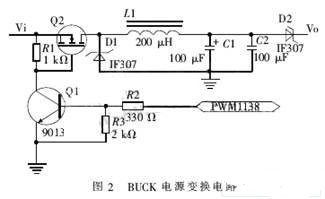 在電能收集過程中,充電器通過控制電壓或者電流來實現(xiàn)不同的充電策略。設(shè)計采用容易控制的、效率高的BUCK變換器。BUCK變換器是用EasyARM1138產(chǎn)生的PWM信號控制的,通過控制PWM的占空比,來控制開關(guān)管Q2輸出電壓或者電流。BUCK變換電路如圖2所示。