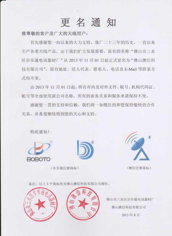 近日獲悉,國內知名的通訊器材(天線)生產商——步步通電訊公司(BOBOTO)將于2013年11月1日起正式更名為“佛山澳信科技有限公司”?!陡ㄖ芬延?月正式對外發(fā)布,并指出更名是為了滿足公司擴大發(fā)展的需要。通知如下: