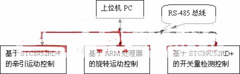 牽引床的總體設(shè)計(jì)采取分布式控制體系,如圖1所示。計(jì)算機(jī)作為上位機(jī)通過RS-485總線與三個(gè)嵌入式控制器(下位機(jī))組成分布式總線網(wǎng)絡(luò)實(shí)現(xiàn)對(duì)床體運(yùn)動(dòng)的控制。計(jì)算機(jī)實(shí)現(xiàn)系統(tǒng)總體操作控制界面。系統(tǒng)復(fù)雜的控制任務(wù)被分解為三部分,分別由三個(gè)嵌入式控制器并行實(shí)時(shí)執(zhí)行完成。其中,牽引運(yùn)動(dòng)及牽引力的檢測(cè)與控制由一片STC89C52RD+單片機(jī)完成;三個(gè)旋轉(zhuǎn)運(yùn)動(dòng)的角度檢測(cè)及控制由Samsong公司的32位ARM核RISC處理器S3C44B0X處理;床體上各類限位開關(guān)等開關(guān)量檢測(cè)及輸出則由另一片STC89C52RD+實(shí)現(xiàn)。
